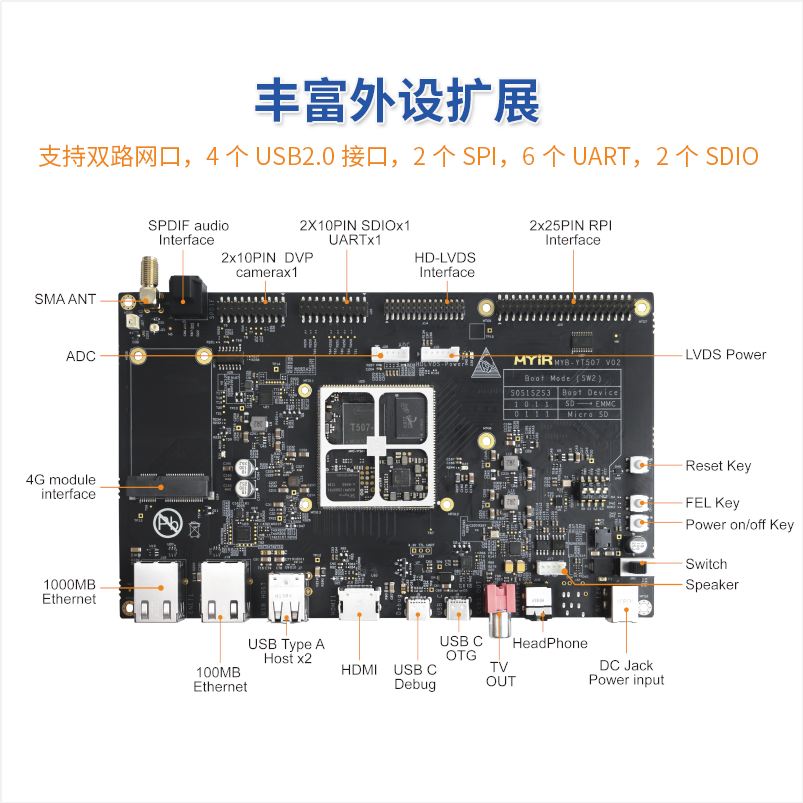 ?丰富外设扩展:支持双路网口,4个USB2.0接口,1个SPI,5个UART,2个SDIO。