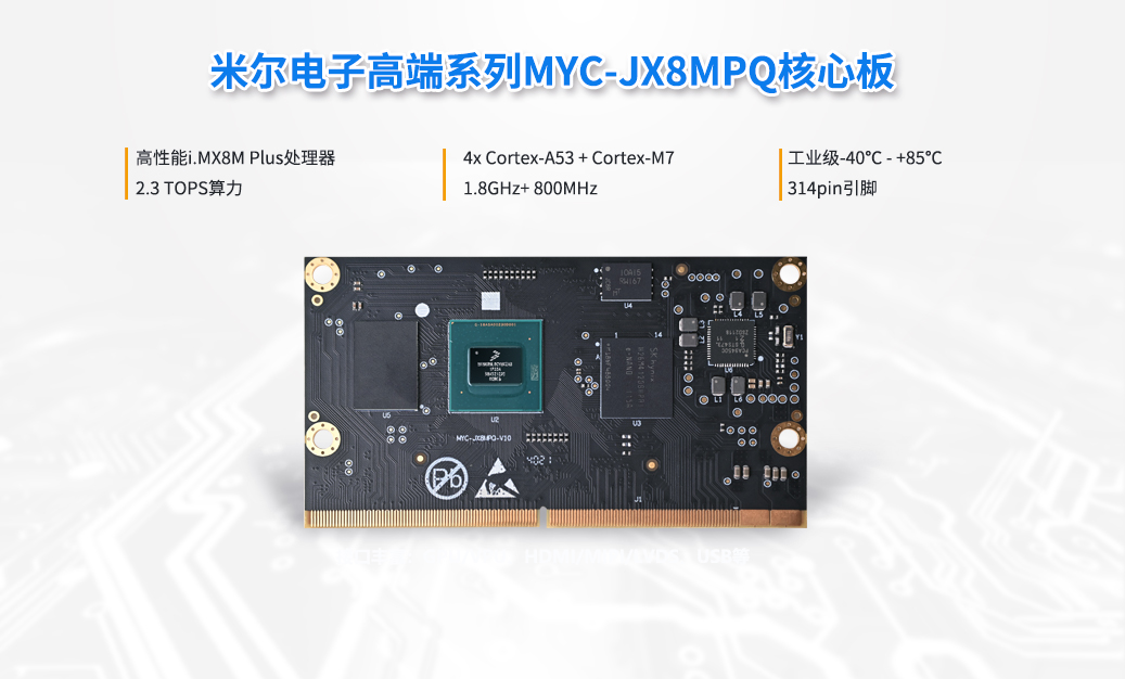 近日,710公海赌赌船官网欢迎您电子高端产品MYC-JX8MPQ核心板及开发板震撼上市,MYC-JX8MPQ核心板采用NXP第一款集成 NPU的高性能处理器i.MX 8M Plus,板载资源丰富,集成了处理器、DDR4、QSPI NOR Flash、eMMC、PMIC电源管理等资源,接口丰富,应用广泛。